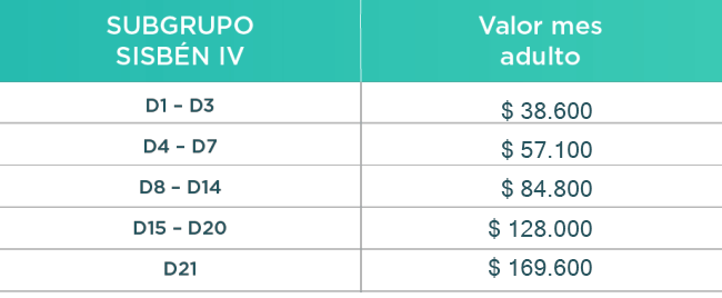 Los valores a pagar corresponden por cada adulto que integra el grupo familiar, este valor depende del subgrupo al que perteneces en la encuesta SISBEN IV